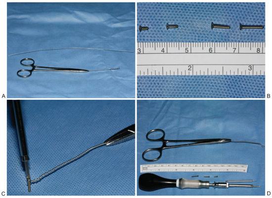 - Kim, M.G.; Yoo, R.E.; Chang, H.; Kwon, S.T.; Baek, R.M.; Minn, K.W. An intermaxillary fixation screw traction wire: an aid for facial bone fracture repair. Ann Plast Surg 2009, 63, 71–73. [Google Scholar] [CrossRef] [PubMed]