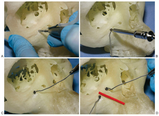 The screw-wire osteo-traction (SWOT) technique demonstrated on synthetic skull. (A) Drilling a screw hole. (B) Placement of the mounted screw through wire loop. (C) Application of traction. (D) Multiple SWOT (red line indicates the fracture line).