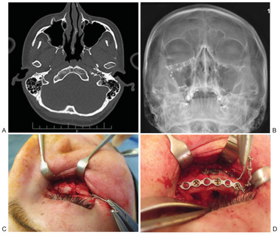 (A) Preoperative axial section of computed tomography scan showing right orbitomalar complex fractures, (B) postoperative occipitomental radiograph showing reduction of right orbitomalar complex fracture, (C) intraoperative photograph showing comminuted inferior orbital rim and application of SWOT, and (D) intraoperative photograph showing reduction of inferior orbital rim, placement of fixation plates.