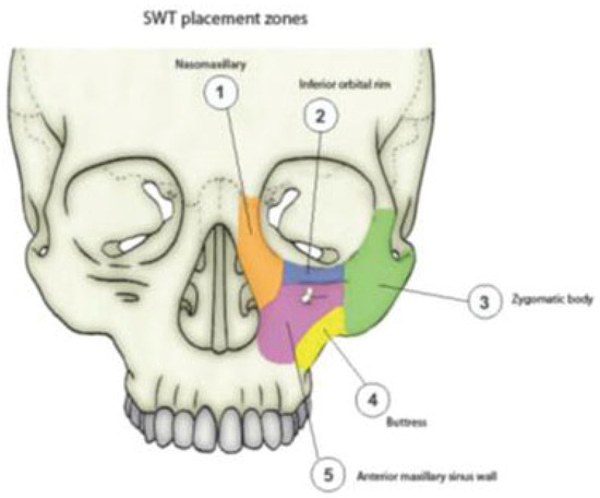 There is a wide variation in the range and pattern of midfacial fractures in clinical practice. The importance of the provision of midface support through a series of but- tresses as described by Manson et al. [6] have provided the basis for our approach to the reduction and fixation of fractures in this series. Figure 4 shows the three vertical buttresses of the maxilla that includes (1) nasomaxillary, (2) zygomaticomax- illary, and (3) pterygomaxillary, as well as two additional loci, (4) the inferior orbital rim and (5) the anterior maxillary sinus wall, where SWOT was used in the patient series.