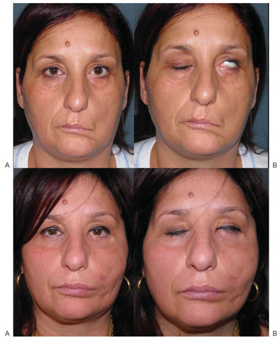 Figure 5. (A) Left facial palsy. (B) Result after blink restoration. SFG was performed as a later stage with improvement of facial volumes and texture. SFG, structural fat grafting.