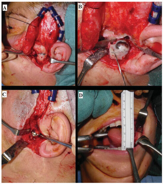 - Omura, S.; Fujita, K. Modification of the temporalis muscle and fascia flap for the management of ankylosis of the temporomandibular joint. J Oral Maxillofac Surg 1996, 54, 794–795. [Google Scholar] [CrossRef]