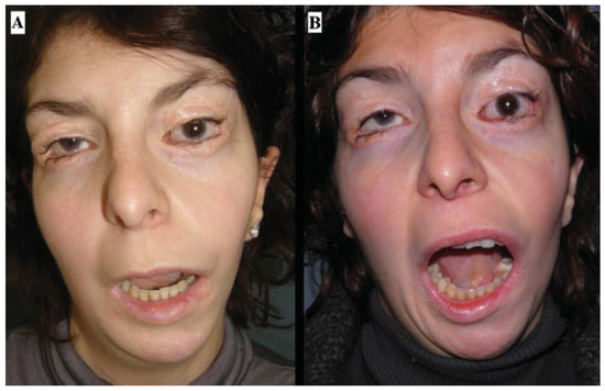 - Nogueira, R.V.; Vasconcelos, B.C. Facial nerve injury following surgery for the treatment of ankylosis of the temporomandibular joint. Med Oral Patol Oral Cir Bucal 2007, 12, E160–E165. [Google Scholar] [PubMed]