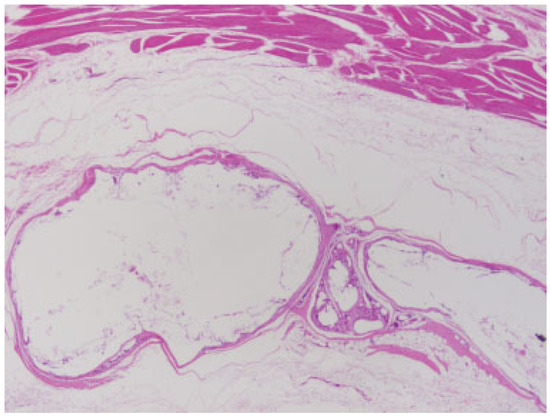 Poly-lactide-glycolic acid plate at 3 months postimplantation. The plate was epithelialized, but did not integrate into surrounding tissue. Note existence of a soft-tissue cavity which contained the implant. (light microscopy, hematoxylin and eosin stain, original magnification ×40).