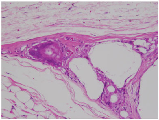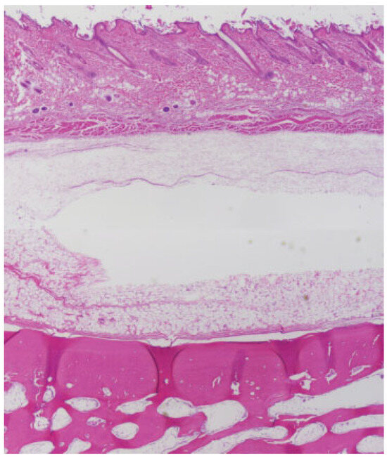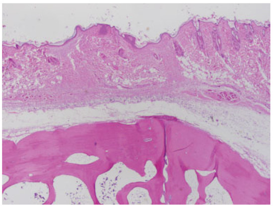 At 3 months, the PLGA implant did not demonstrate any decrease in plate visibility or gross integration into the surrounding tissue (Figure 7). The plate was covered by a thin layer of fibrous tissue suggestive of capsulization. The implant was too hard for scalpel sectioning, and as a result, histological evaluation could only be performed on the soft tissue and bone surrounding the implant material. Microscopic examination of this tissue demonstrated no evidence of inflammatory cell infiltration or foreign-body giant cell reaction (Figure 8). The scalp soft tissue and the underlying bone were normal in appearance.