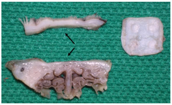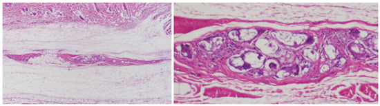 The microscopic findings at 6 and 12 months were similar to those for the 3-month period. There was no gross evidence of implant material integration. The surrounding soft tissues and bone were normal in appearance with no evidence of inflammation. At 12 months, the implant was more friable with some visible fracturing. The implant material was still grossly visible within the soft tissue periosteal pocket. In addition, there was more notable tissue indentation identified on gross examination, which may suggest increased adherence of the implant to the tissue lining the periosteal pocket (Figure 9).