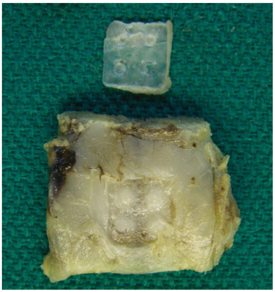 Gross appearance of poly-lactide-glycolic acid plate at 12 months postimplantation. The implant remained separate from the tissue, but was more friable with some fracture lines along the edges. Note that the tissue cavity was more prominent, which may suggest better adherence.