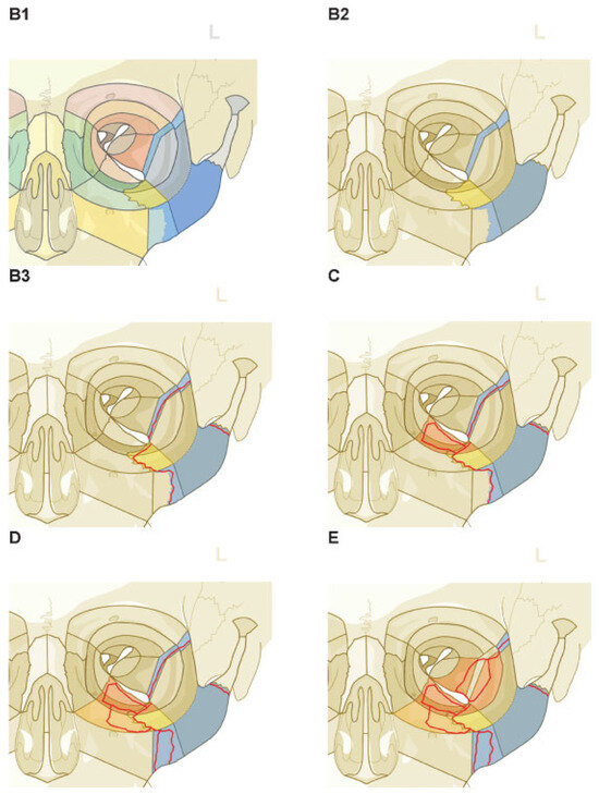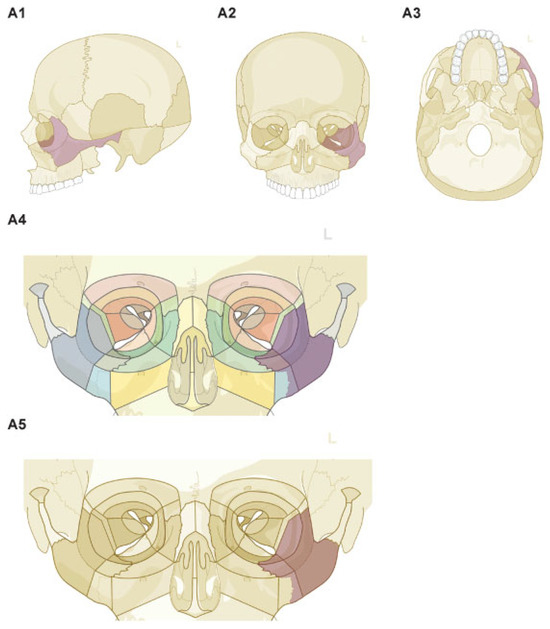 An alternative pathway to outline the en bloc zygoma fracture prototype is to select the subregions separately. The graphical scheme of such an assembly will have a different look and color scheme (Figure 5B,C), but it provides a roadmap to capture and classify fractures of increasing complexity owing to plural fractures and involvement of adjoining topographical regions. In a systematic process, the subregions of the zygoma/zygomatic arch ensemble and its vicinity can be labeled as fragmented or/and displaced with or without bone loss to account for any increments in the magnitude of the respective fracture pattern (Figure 5).