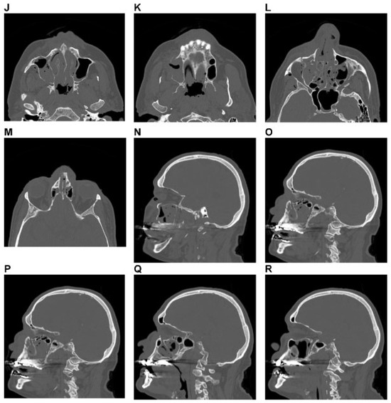 Asymmetric Le Fort Level midface fracture. Three-dimensional (3D) computed tomographic (CT) scans— (A) frontal view, (B) lateral view right, (C) lateral view left, (D) basal view—mandible removed; (E) panoramic X-ray–OPT; (F, G) 3D CT scans—oblique views, right,left (H, I) coronal CT scans. (J–M) axial CT scans; (N) sagittal CT scans—at lateral lamina of pterygoid process right, (O) at medial lamina of pterygoid process right, (P) at medial lamina of pterygoid process left, (Q) at lateral lamina of pterygoid process left, and (R) at lateral orbital rim left. (S) Level 3 Code : 92 I0i.L0.Pt0.Oim.U1m.Omil.Pt0.L0.Z0, Orbit (right): R(im).W1(im)2(i), Orbit (left): R(lm).W1(lim)2(i), This case example CMTR-92-101 is made available electronically for viewing using the AOCOIAC software at www.aocmf.org/classification. Narrative description: Le Fort analogous midface fracture (central right—types I and II/centrolateral left types I and III). Unilateral NOE fracture right—large fragments, multifragmentation of facial antral wall right, nasal skeletal fracture (multifragmanted and displaced) involving both frontonasal processes and nasal bones not reaching cranially to the nasofrontal suture. Partial Dentition (FDI): Lack of 18–14; 24–28. Maxillary alveolar process atrophy: moderate. Pterygoids: bilateral incomplete horizontal fractures, no pterygomaxillary disjunction, i.e., vertical separation. Displacement: No retrodisplacement of both maxillae, no displacement of the Le Fort I and III fragments left, multifragmentation facial antral wall right, minor displacement of frontonasal fragment right. Internal orbits: Involvement confined to anterior and midorbit sections: right, medial and inferior walls, left medial, inferior and lateral walls.