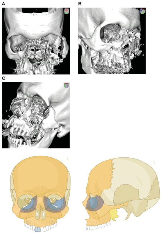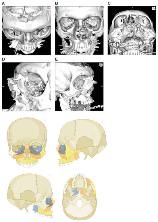 - Donat, T.L.; Endress, C.; Mathog, R.H. Facial fracture classification according to skeletal support mechanisms. Arch Otolaryngol Head Neck Surg 1998, 124, 1306–1314. [Google Scholar] [CrossRef] [PubMed]