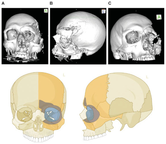 - Manolidis, S.; Weeks, B.H.; Kirby, M.; et al. Classification and surgical management of orbital fractures: Experience with 111 orbital reconstructions. J Craniofac Surg 2002, 13, 726–737, discussion 738. [Google Scholar] [CrossRef]