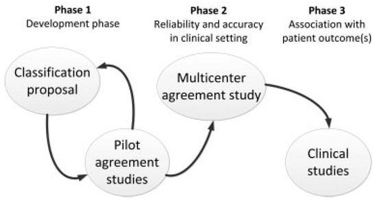 In the development and validation of classification systems, Audigé et al [35] suggested implementing a methodological pathway with three successive research phases (Figure 2). The first phase involves clinical experts developing a blue-print for the classification system, as well as defining the assessment technique (e.g., clinical information, image modalities, measurement aids). Precise definitions and instructions need to be worked out to define a common language by which surgeons should be able to understand, identify, and describe injuries in a uniform way. Successive pilot agreement studies are conducted to evaluate the reproducibility of the classification performed by clinical experts. The natural tendency of all CGs was to initiate the development by proposing a very detailed system to address all injury patterns. Participants realized after a few evaluation sessions that simplification is only warranted, along with the clarification of definitions for terms that are commonly used (e.g., “fragmentation” or “comminution”). This process is not easy and involves translating clinical experience (pattern recognition) into a set of standardized definitions. At this stage, the predictive clinical value of any proposed system is evaluated by expert opinion (concept of face validity, that is, the classification should look good on clinical ground). The second phase involves a multicenter agreement study to ensure that future users with less clinical experience can understand and agree on the classification system. This creates the basis for a classification tool to be used for documentation and evaluation of treatment options. Only after these first two phases have been completed can a third phase involving prospective clinical documentation be implemented to support future recommendations for patient care based on the classification.