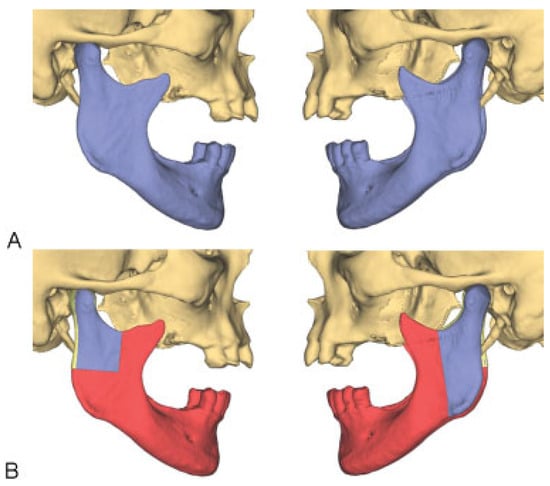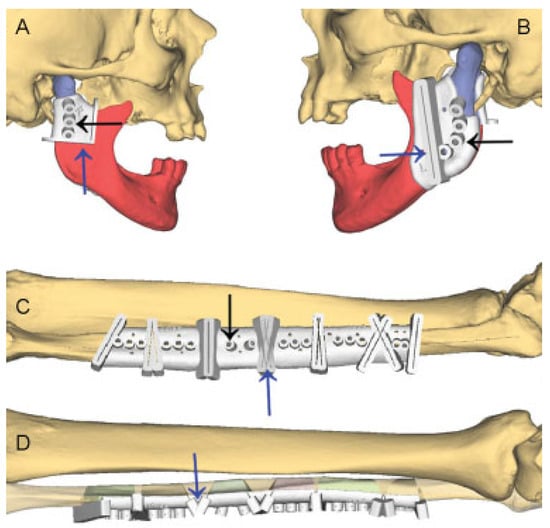Figure 9A,B). By contrast, the positioning of the cutting guides on the fibula was more difficult. This can be explained by the attachment of soft tissue (periosteum, connective and muscle tissue) to the fibula and the shape of the fibula, which is a straight bone and has no prominent edges or points similar to the mandibular angle. The cutting guides were therefore difficult to position accurately in the distal to proximal direction. Nevertheless, the cutting guides were placed on the fibula in a clinically appropriate way (