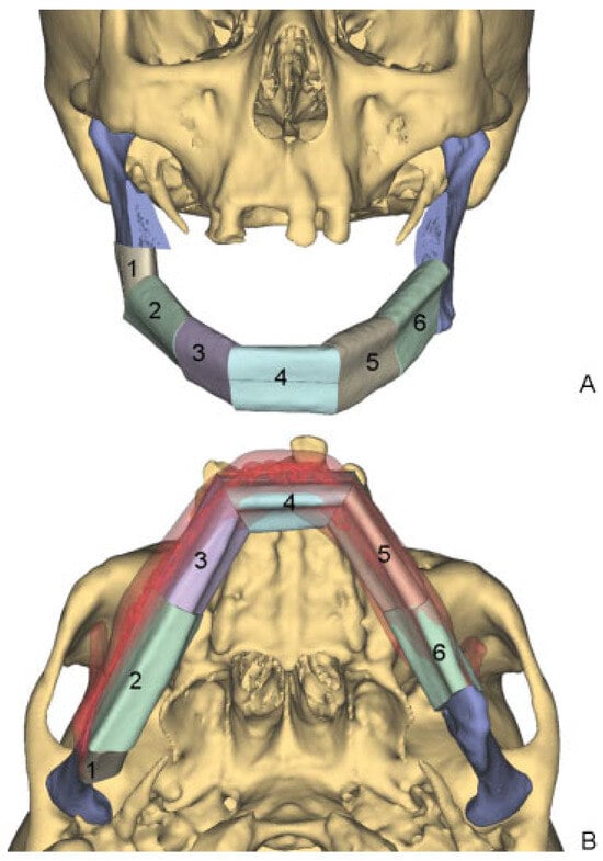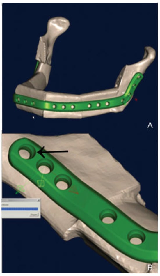 Figure 9B). The objective of this approach was to ensure that the plate was placed exactly in the planned position especially in the region of the remaining mandibular segments. Particular care was taken to maintain the position of the residual mandibular segments (rami and condyles) and to accurately transfer virtual planning to surgery. After the Web meeting, a final mandibular reconstruction plan was prepared by the engineers from Materialise