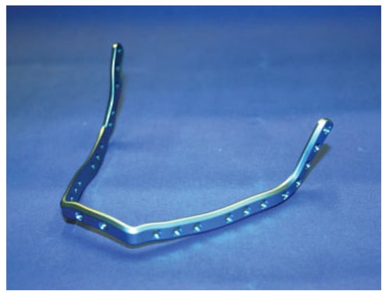 Figure 5). The plate described here had 24 holes. The holes in the regions of the right and the left ramus were angled (15 degrees) in the craniocaudal direction (