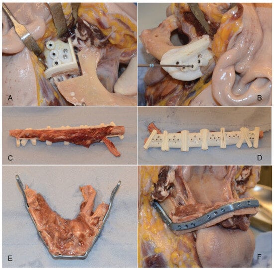 Figure 9 provides an overview of the various steps of the cadaver study presented here. The resection guides were placed on the mandible and the cutting guides were placed on the fibula in a clinically appropriate way. In the clinical setting, no problems were encountered in positioning the resection guides on the mandible as planned (