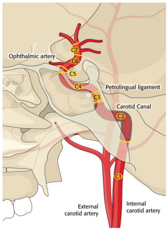 - Bouthillier, A.; van Loveren, H.R.; Keller, J.T. Segments of the internal carotid artery: a new classification. Neurosurgery 1996, 38, 425–432, discussion 432–433. [Google Scholar]