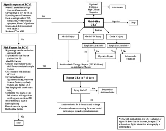 - Bromberg, W.J.; Collier, B.C.; Diebel, L.N.; et al. Blunt cerebrovascular injury practice management guidelines: the Eastern Association for the Surgery of Trauma. J Trauma 2010, 68, 471–477. [Google Scholar] [CrossRef] [PubMed]