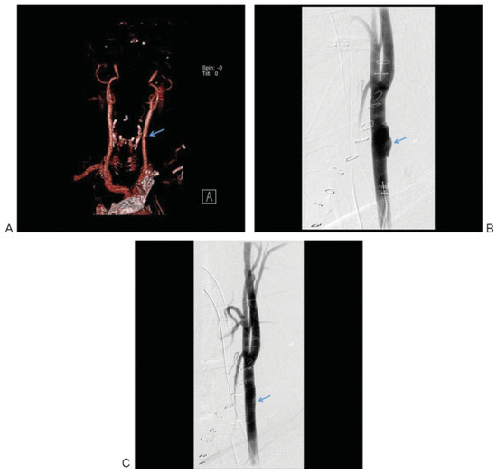 - Yi, A.C.; Palmer, E.; Luh, G.Y.; Jacobson, J.P.; Smith, D.C. Endovascular treatment of carotid and vertebral pseudoaneurysms with covered stents. AJNR Am J Neuroradiol 2008, 29, 983–987. [Google Scholar] [CrossRef]