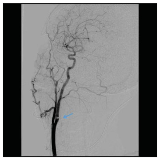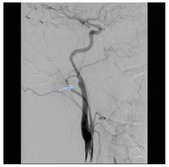 - Kraus, R.R.; Bergstein, J.M.; DeBord, J.R. Diagnosis, treatment, and outcome of blunt carotid arterial injuries. Am J Surg 1999, 178, 190–193. [Google Scholar] [CrossRef] [PubMed]