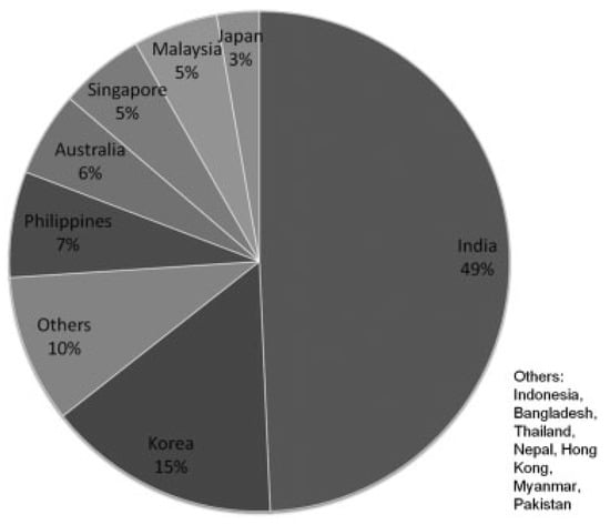A total of 131 invitations were sent out between May 2012 and December 2012. Seven e-mail addresses were invalid at the time the survey was conducted. Of the remaining 124, 74 (59.7%) attempted the survey. Of the 74 responses, 93.2% were fully completed and 6.8% were partially completed. Responses were collected from a total of 14 countries and the breakdown of the country of practice of the participants is shown in Figure 1. The countries with the most responses were India and Korea. Of the 74 responses, 67 (90.5%) received formal oculofacial fellowship training, 30 (48.4%) were trained outside their country of practice, 56 (75.7%) were full-time practicing oculofacial surgeons, 47 (63.5%) practiced in an institution, and 52 (70.3%) were registered members of APSOPRS.