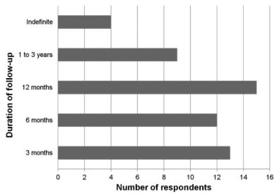 Figure 2 shows the most common complications after orbital floor fracture repair, and diplopia (30/44, 68.2%) was the most common complication. Although no participants reported blindness as the most common complication in their practice, up to 8.0% (4/49 respondents) encountered patients with blindness after orbital floor fracture repair. The duration of follow-up for uncomplicated repair of orbital floor fracture is shown in Figure 3. Most of the oculofacial surgeons would prefer to follow-up patients for 3 to 12 months (40/49, 81.6%).