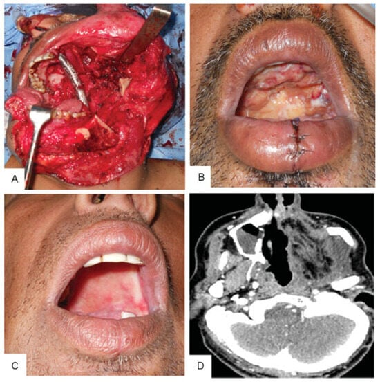 - Kekatpure, V.D.; Manjula, B.V.; Mathias, S.; Trivedi, N.P.; Selvam, S.; Kuriakose, M.A. Reconstruction of large composite buccal defects using single soft tissue flap—analysis of functional outcome. Microsurgery 2013, 33, 184–190. [Google Scholar] [CrossRef] [PubMed]