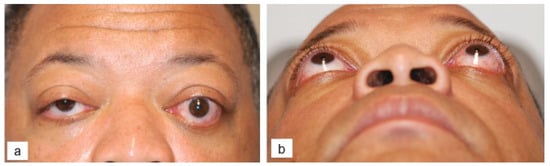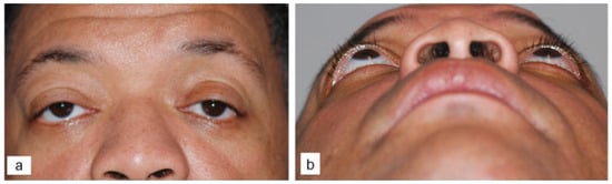 Patient 1, frontal (panel a) and submentovertex (panel b) views after asymmetric orbital decompression surgery, upper and lower lid retraction repair, and lateral canthal surgery.