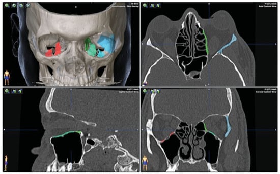 - Gordon, C.R.; Susarla, S.M.; Yaremchuk, M.J. Quantitative assessment of medial orbit fracture repair using computer-designed anatomical plates. Plast Reconstr Surg 2012, 130, 698e–705e. [Google Scholar] [PubMed]
