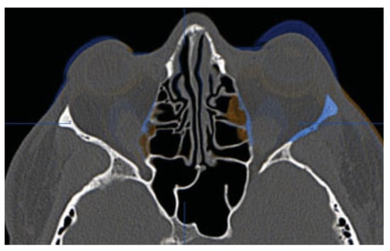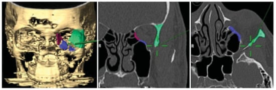 DICOM data from the CT study were imported into the planning software (iPlan CMF 3.0 BrainLab, Brainlab Inc., Westchester, IL) for preoperative planning. For each wall involved, the planned resection sites were indicated using different colors (Figure 2). A one-wall (orbital floor) decompression was planned on the right side and a three-wall decompression (lateral wall, floor, and medial wall) was planned for the left side.
