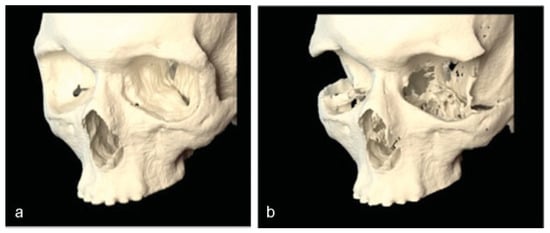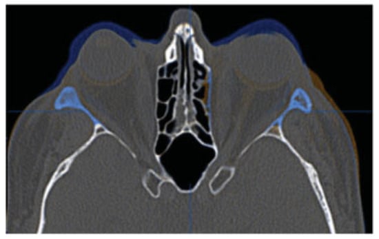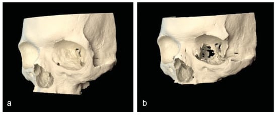 - Tavassol, F.; Kokemüller, H.; Müller-Tavassol, C.; Schramm, A.; Rücker, M.; Gellrich, N.C. A quantitative approach to orbital decompression in Graves’ disease using computer-assisted surgery: a compilation of different techniques and introduction of the “temporal cage”. J Oral Maxillofac Surg 2012, 70, 1152–1160. [Google Scholar]