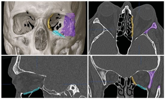 - Lee, H.; Lee, Y.; Ha, S.; Park, M.; Baek, S. Measurement of width and distance of the posterior border of the deep lateral orbital wall using computed tomography. J Craniomaxillofac Surg 2011, 39, 606–609. [Google Scholar] [CrossRef]