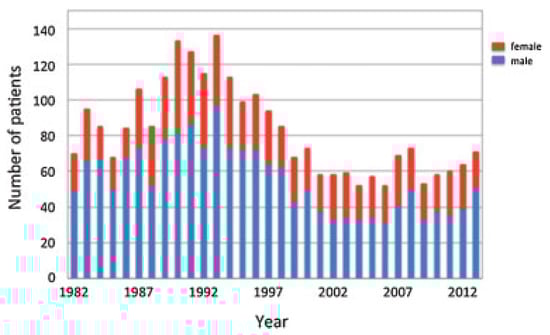 Of the 2,636 patients, 1,764 were males (66.9%) and 872 females (33.1%) (Table 1). The age of the patients ranged from 9 months to 99 years with an average of 33.6 years. The age distribution showed 748 patients (28.4%) in the second decade of life and 601 (22.8%) in the third. The average number of patients per year was 82.4 years, but the annual number of patients changed during the period. In the late 80s and the mid-90s, more than 100 patients were observed each year (Figure 1). However, the number has decreased to approximately 60 in the past 15 years. The male to female ratio has slightly changed from 7:3 in the early period to 6:4 in the late period. The age of the patients has shifted to older age during the 32 years (Figure 2). Patients younger than 30 years consisted of approximately 60% in the early period but have decreased to around 40% in recent years. In reverse, patients aged 60 years or older were fewer than 10% in the 80s but have reached around 30% in recent years.