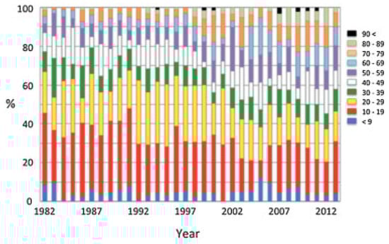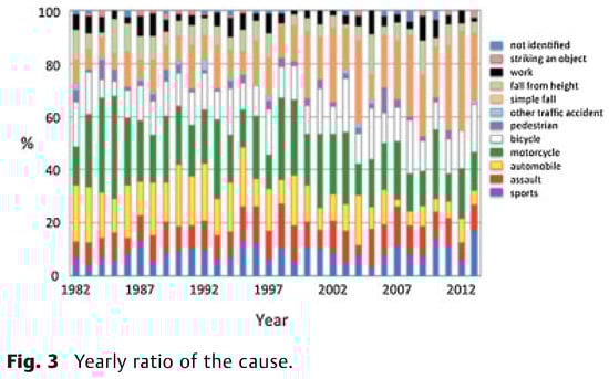 Causes of injuries showed that traffic accidents were the most common cause of fractures throughout the period and consisted of more than half of the patients [,,,,,,,]. However, fractures in traffic accidents have been gradually decreasing in recent years, especially those in automobile and motorcycle accidents. These results may reflect the spread of safety equipment in these vehicles and the decreased population of motorcycle riders. Bicycle accidents were observed throughout the period because bicycles are commonly used for transportation by people of all ages, especially by young students []. Injuries in sports and by assaults were also observed throughout the period and were dominant in male patients [,,]. On the other hand, fractures by simple falls increased markedly and consisted of approximately 30% of all patients in recent years. These results were considered to reflect the increase of the older population. Older patients are likely to be injured by falling in daily life, probably because of the physiological consequences of aging, such as a reduced ability to balance and to avoid environmental hazards, the presence of systemic pathological conditions, and the use of psychotropic drugs [,,].