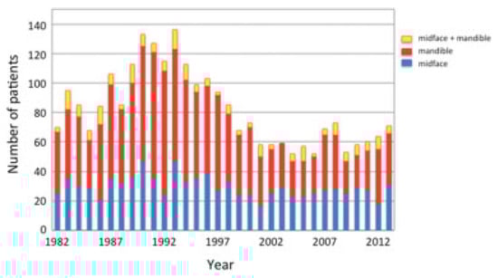 Yearly distribution of midfacial and mandibular fractures.