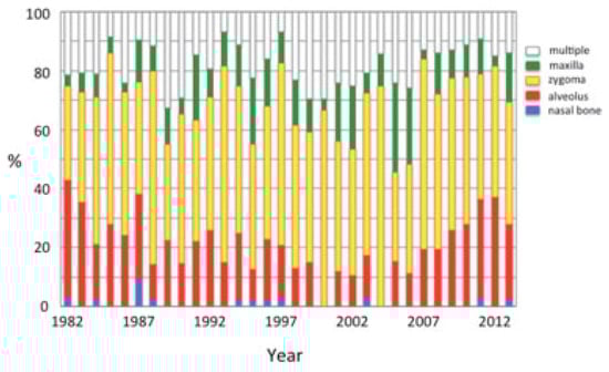 In the mandible, fractures were most frequently observed in the condyle, followed by the symphysis and the body. These results reflect that trauma force was applied in the symphyseal region, causing indirect fractures of the condyle with or without fractures in the symphyseal region, especially in patients injured by a simple fall [].The increase in condylar fractures in the recent period is considered due to the increase in the older population and in simple falls as the cause of the injuries. Mandibular angle fractures were commonly observed in patients injured in sports and by assaults [,,]. One of the reasons for these results is that the trauma force was applied laterally. The other is the presence of the third molar tooth at the site of the impact, because angle fractures were mostly observed in patients around 20 years old []. Symphyseal fractures were also common in patients injured in various causes and consisted of more than 20%, because the symphyseal region is also anatomically susceptible to traumatic impact. The recent decrease in symphyseal fractures may result from decreased automobile and motorcycle accidents.
