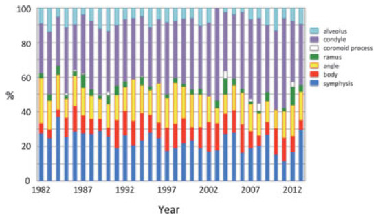 Yearly ratio of fracture sites of the mandible.