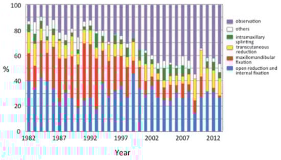 Treatment for the fractures is shown according to fracture site (Table 5). Treatment of each patient was defined as the most aggressive treatment chosen for fractures if they were observed at multiple sites. ORIF was performed in 782 patients (29.7%), followed by observation in 716 (27.2%), MMF in 605 (23.0%), IMS in 294 (11.2%), TCR in 126 (4.8%), and others in 113 (4.3%). More than 60% of the patients with fractures in both the midface and mandible were treated by ORIF, although about one-fourth of the patients with fractures in either the midface or mandible were treated by ORIF. More than 90% of MMF was performed for mandibular fractures. All TCR were performed for midfacial fractures. IMS was chosen for approximately 10% of midfacial and mandibular fractures. Others included tooth extraction and/or gingival suture at the site of alveolar fractures. Observation was chosen in 40% in the midface and in 20% in the mandible. In the midface, TCR was exclusively chosen for fractures of the zygoma, and IMS was chosen for alveolar fractures (Table 6). ORIF was performed for more than 50% of multiple fractures. Observation was also common for fractures of the nasal bone, zygoma, and maxilla. In the mandible, IMS was exclusively chosen for alveolar fractures (Table 7). MMF was performed in approximately 40% of patients. ORIF was chosen at a higher rate as the number of involved sites increased. Observation was relatively common in fractures of a single site. During the 32 years, treatment modalities have changed markedly (Figure 7). MMF has decreased from 30% in the early 90s to less than 5% in the past 15 years. In reverse, observation has increased from 20% in the early period to 40% in the past 10 years.