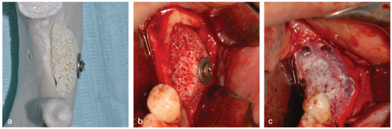 Cone beam CT (CBCT) scans were obtained, and the residual ridge was measured. A stereolithographic ridge model was prepared and used to shape a heterologous spongy bone block (Osteoxenon, OX52, Bioteck, Arcugnano, Italy), containing preserved bone collagen (Figure 1a). After shaping, the block was sterilized by β-irradiation.