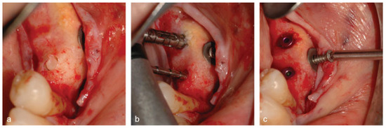 At 8.5 months after grafting, the same antibiotic prophylaxis was begun, and another flap was raised. The membrane and pins were removed (Figure 2a) and two bone samples were collected with a trephine, under irrigation, at implant placement sites corresponding to positions #19 and #20 (Figure 2a,b). Two implants (Prime, Prodent Italia, Pero, Italy) were placed, and the osteosynthesis screw was removed (Figure 2c).