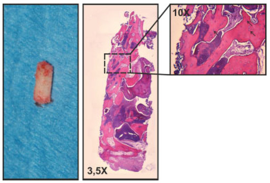 One of the two biopsies collected from the grafted site and the hematoxylin-eosin staining of the bioptic sample. The 10X magnification detail shows the absence of inflammatory reaction and the graft material undergoing remodeling; black arrows indicate the osteocytes into the newly formed bone.