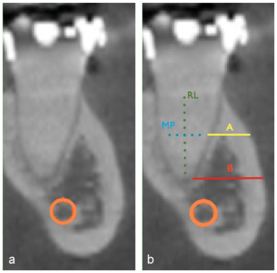 Figure 1. (a) Initial CT-scan imaging formatted with Dental Slice software (Bioparts Prototipagem Biomedica, Brasília, DF, Brazil). (b) CT-scan imaging presenting the measurements: root length (RL—dotted line), mean point (MP—dotted line), distance A (a), and distance B (b).