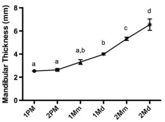 Figure 3. Distribution of mandibular thickness on premolar and molar sites. Different letters denote different statistical groups.