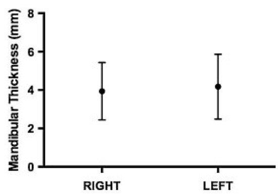 Figure 2. Distribution of mandibular thickness per side. No statistical difference was found between right and left sides (p = 0.1652).