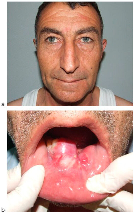 (a) No facial asymmetry noted. (b) The lesion in oral cavity.