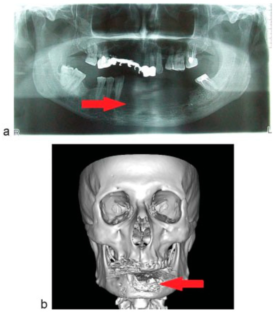 (a) Preoperative radiological picture: OPG. (b) Preoperative radiological picture: 3D CT scan. The area of bone destruction (arrow).