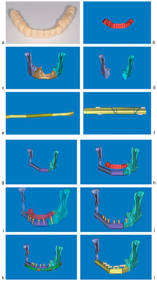 (Figure 3e–g). Pre-scanned bridge prosthesis is adapted to the bone graft and by means of its three-dimensional shape and form, the number, and type of dental implants as well as their positioning within graft, is determined. The length, diameter, and angle of positioning of the implant are calculated, as well as volume of soft-tissue compound around the dental implants (Figure 3h–j). Reconstructive plate is adapted to the bone graft and the sites of the screws are marking out apart to dental implants (Figure 3k). Finally, virtual measurements of angulation and distance between implants were asses (Figure 3l).