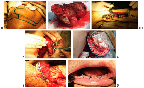 (a) Surgical approach via labio-buccal flap elevation. (b) Excised tumor. (c) Application of navigation template for dental implants placement. (d) Application of navigation template for bone osteotomy. (e) Formed transplant of the mandible comprising dental implants prior to perineal artery and vein transfer. (f) The graft is positioned and fixed within recipient site and micro vascular anastomosis created. (g) Application of abutments and forming of soft tissue around it, wound closure.