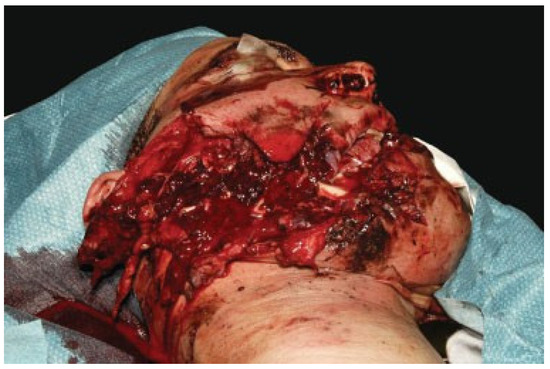 A 29-year-old man was hit directly in the face by a rocket in the night of January 1, 2011. The patient was seen at the emergency department of our institution according to the Advanced Trauma Life Support protocol. His airway was threatened due to serious bleeding from extensive soft-tissue injury and the patient was immediately intubated with an endotracheal tube, under the use of etomidate as sedative and succinylcholine as paralytic agent. The patient was hemodynamically stable. Severe soft-tissue injuries to the right side of the face were observed (