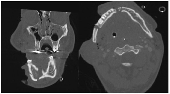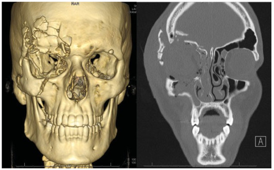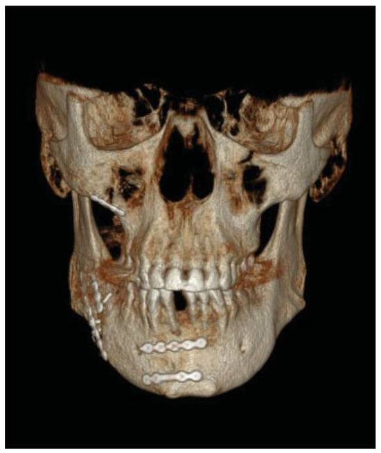 Computed tomography (CT) angiography images of the face, cranium, and the neck were obtained and revealed multiple fractures as follows: communitive fracture of the mandible; a Le Fort 2 fracture; a midline fracture of the maxilla; extensive fractures of the walls of the right maxillary sinus and both right and left orbital floor; a right zygomatic arch fracture; and fracture of the right temporal bone at the temporoman-dibular joint (